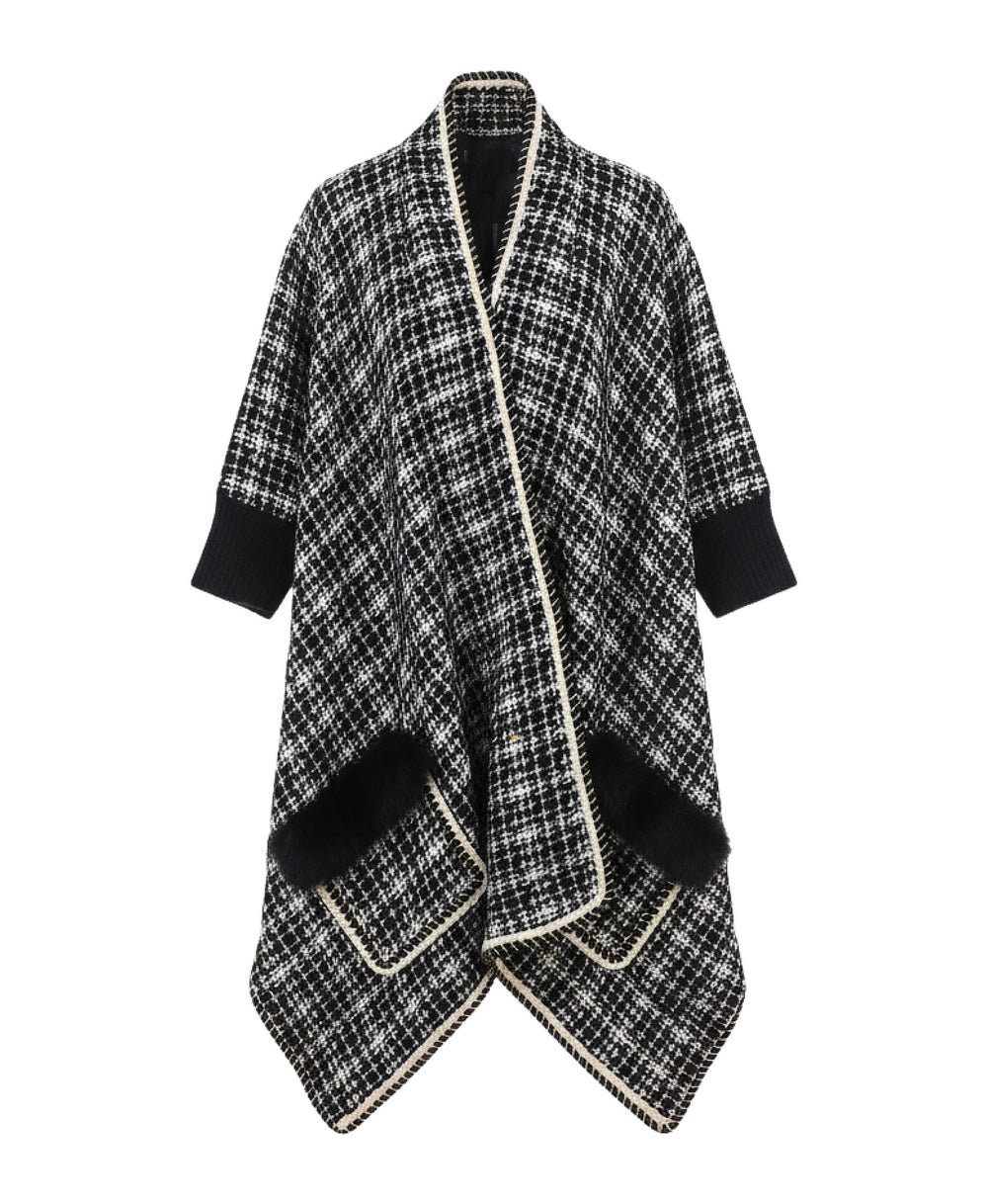 - Plaid Wrap w/ Shimmer Detail & Fox Fur Trim Pockets
